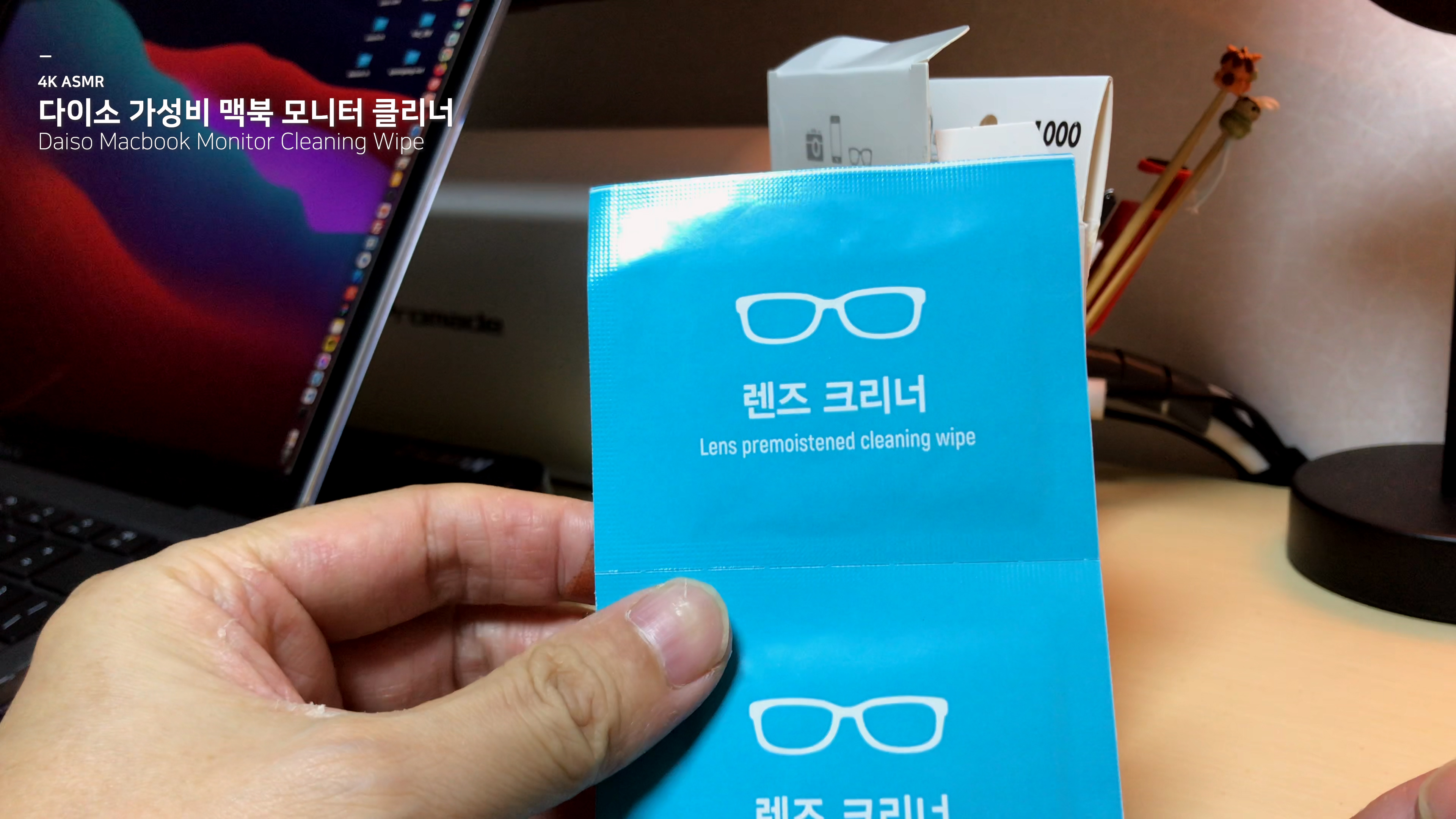맥북 에어의 레티나 디스플레이가 색감이 좋긴 하지만 열고 닫을 때 마다 오염이 쉽게 되는 단점이 있습니다. 그래서 일주일에 한두번은 닦아야 하는데 안경 닦이로는 잘 안 닦이는 것 같아서 다이소에 들린 김에 렌즈 클리너를 구입해서 써보았습니다.
