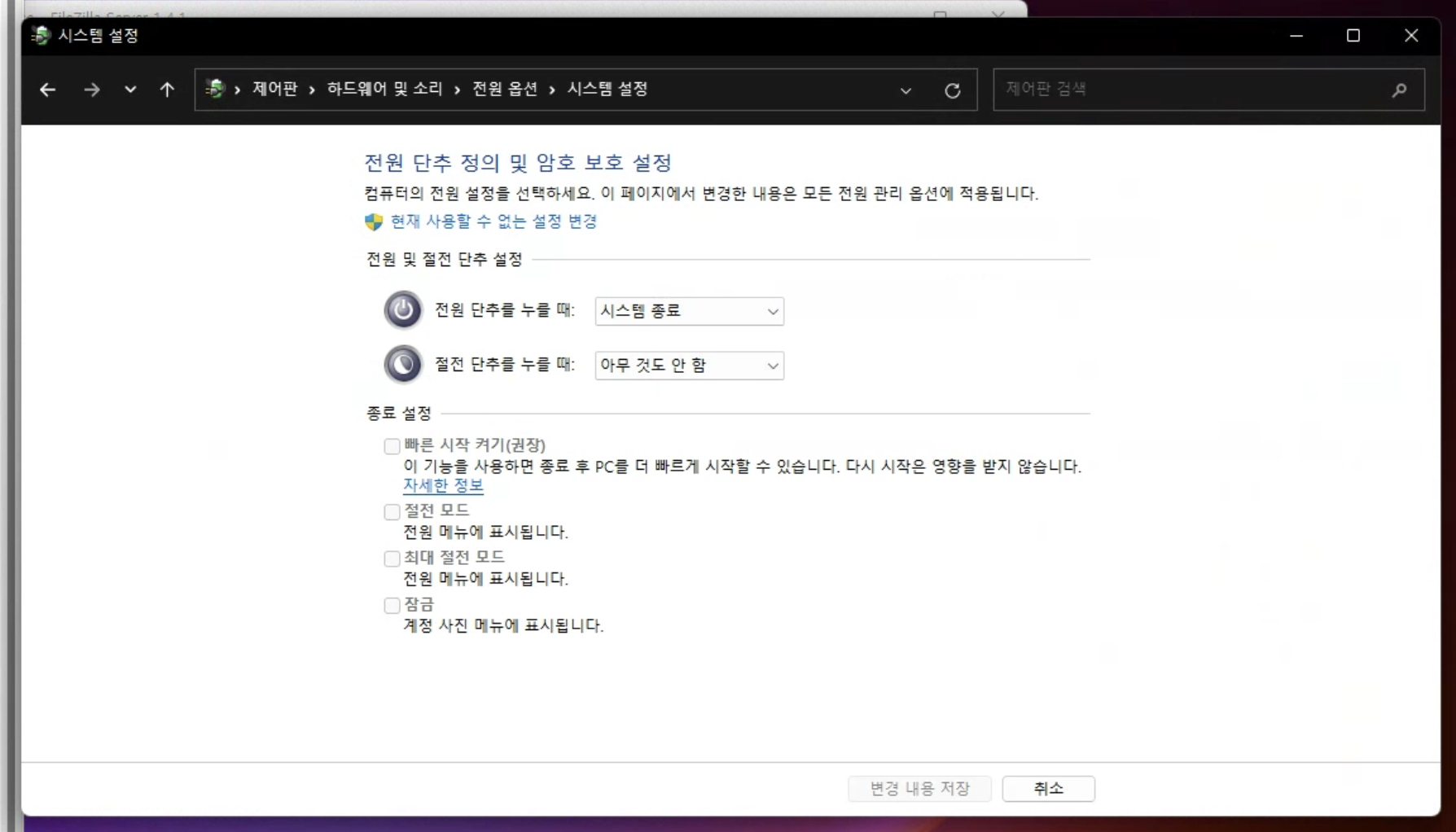 4. 종료 설정에서 원하지 않는 기능은 체크 해제 후 [변경 내용 저장] 클릭