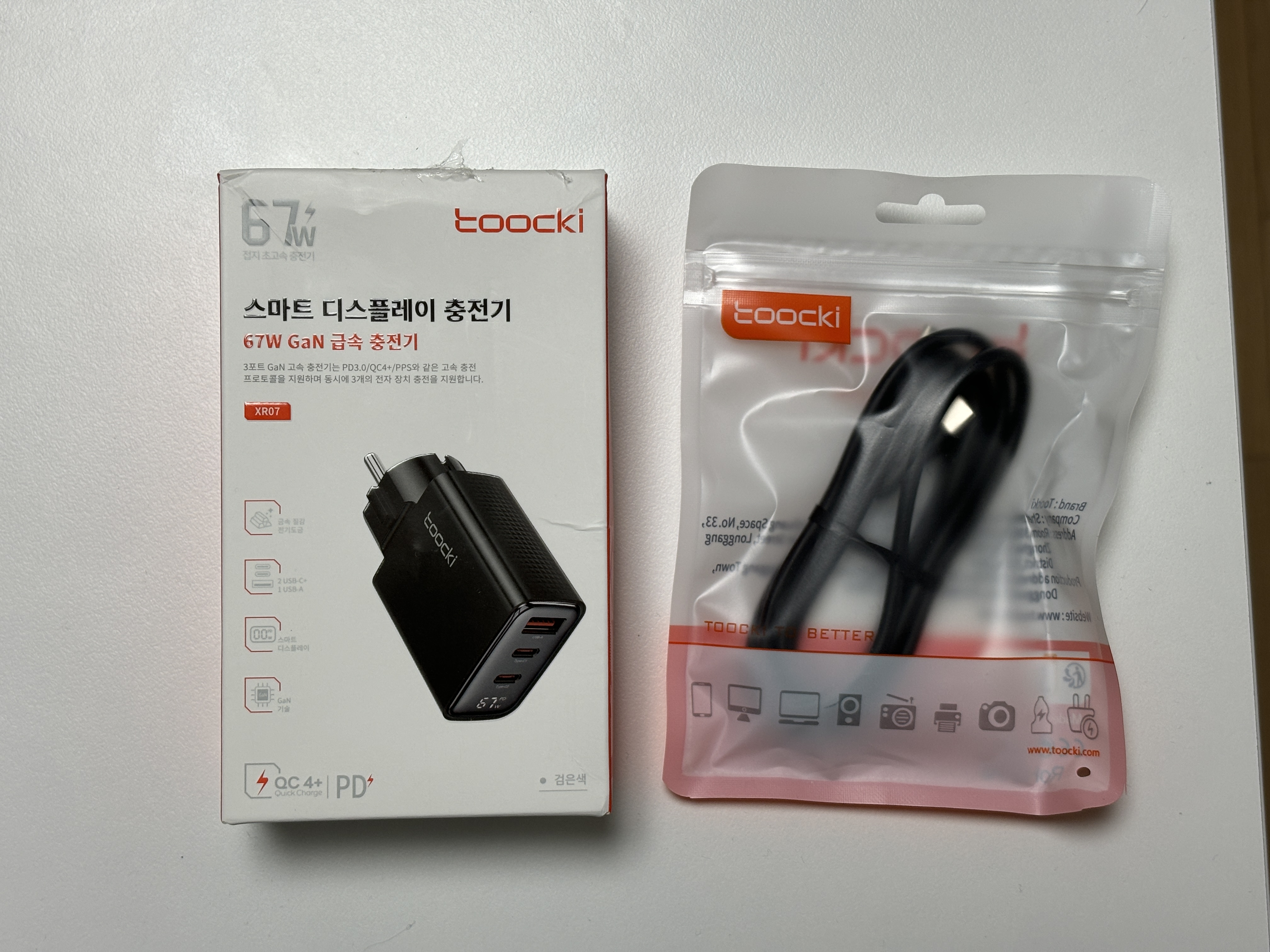 사무실에 사용하던 충전기가 접지가 되지 않아서 불편하던 차에 가성비 좋은 접지 PD 충전기를 발견해서 구입하였습니다. 2024년 4월 25일 기준 1만원대 충전기가 접지도 되고 67W 출력에다 충전량까지 LCD로 확인 가능하고, 100W c to c 충전선까지 주면, 말 다했죠. 로켓직구라 14일(일) 주문하였는데 다음날인 15일(월) 통관이 되고 17일(수)에 배송이 완료되었습니다. 직구인데도 엄청 빨리 배송되어서 더 마음에 듭니다.