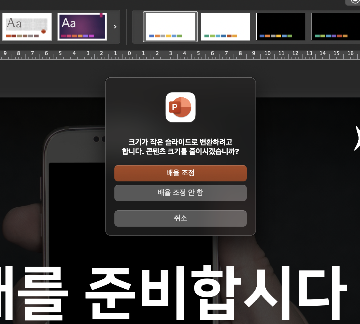 슬라이드의 크기를 변경하기 때문에 구성 요소들의 비율까지 수정하지는 않습니다. 비율 변경 후 추가 수정이 반드시 필요합니다.