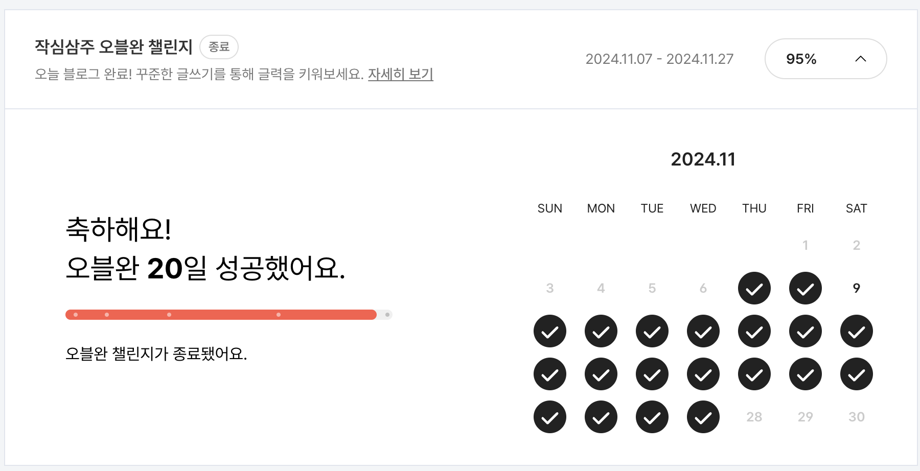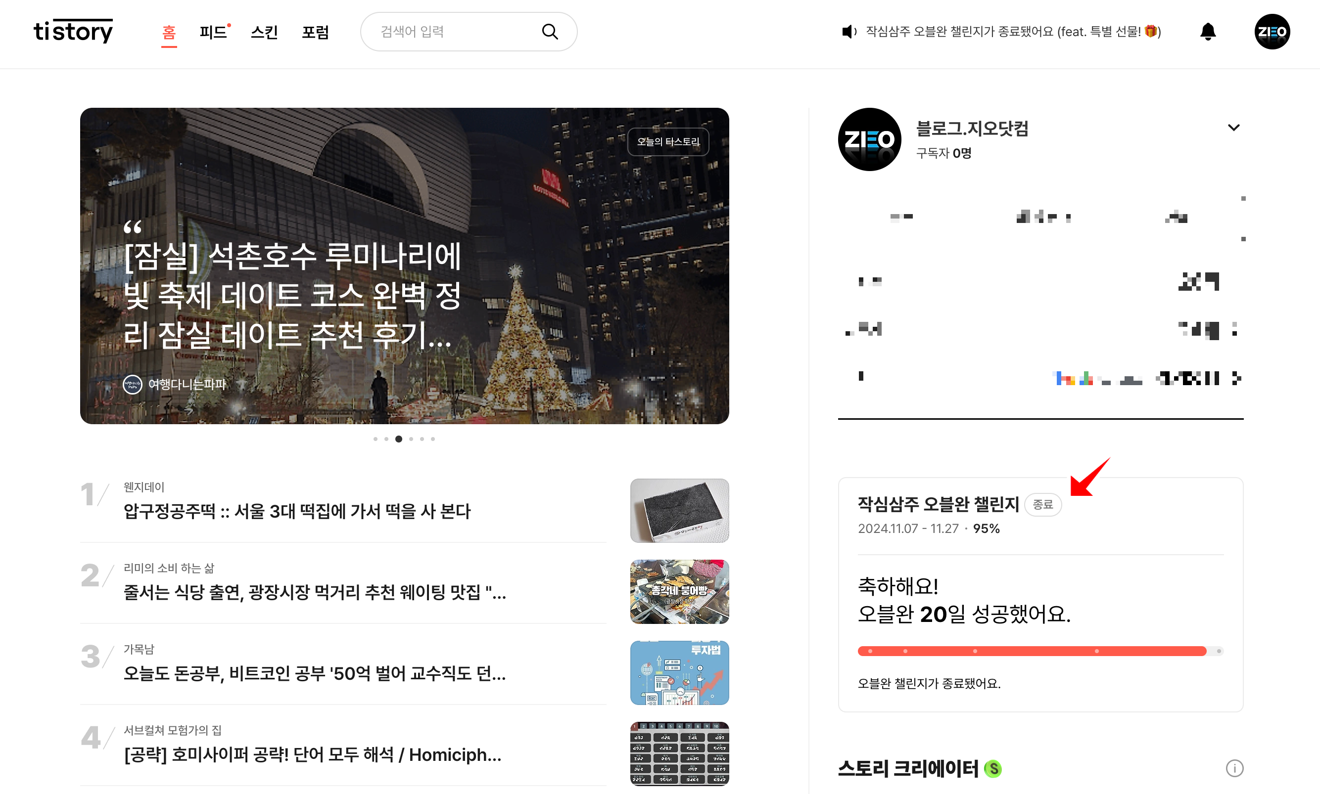 티스토리의 오블완 챌린지가 2024년 11월 27일 부로 종료하였습니다. 21일 동안 블로그에 글을 쓰는 챌린지 였는데 저는 깜빡해서 하루 참여하지 못했습니다. 언제 참석하지 못했는지 확인하기 위해 찾아보니 티스토리 홈페이지 우측 하단에서 확인할 수 있었습니다.