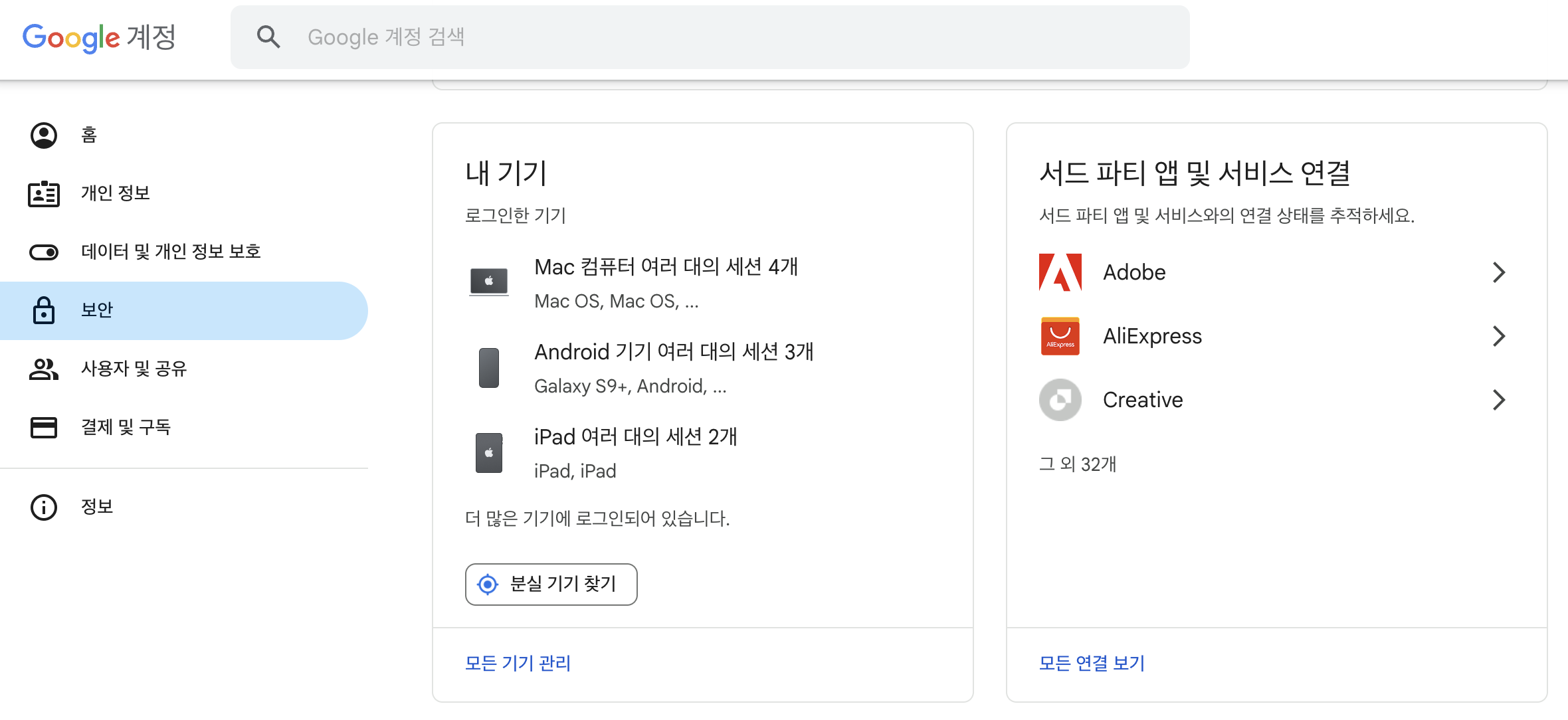 혹시 내 구글 계정이 이상한 기기에서 로그인 되는지, 이상한 앱과 연동되어 있는지 확인하는 주소는 아래와 같습니다.