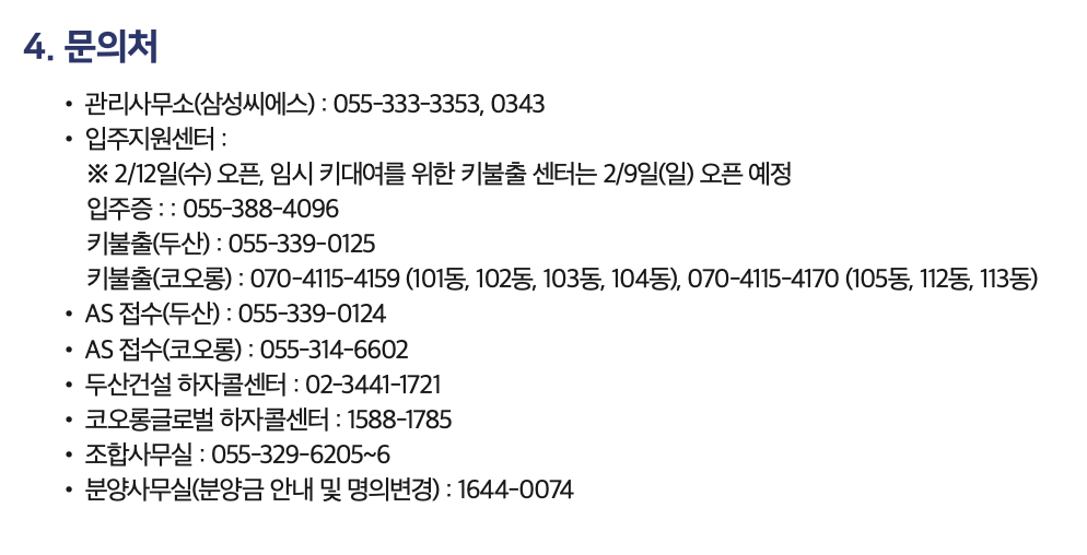 키불출(코오롱) : 070-4115-4159 (101동, 102동, 103동, 104동), 070-4115-4170 (105동, 112동, 113동) - AS 접수(두산) : 055-339-0124