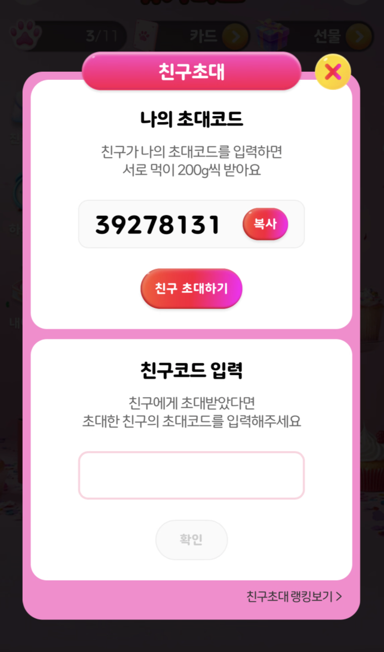 11번가엔 11키티즈 라는 고양이 키우는 미니 게임이 있습니다. 매일 특정 미션을 하면 고양이에게 줄 수 있는 사료를 주는데, 이 중 친구를 초대해야 하는 미션이 있어요. 저는 이미 친구를 추가했었네요!