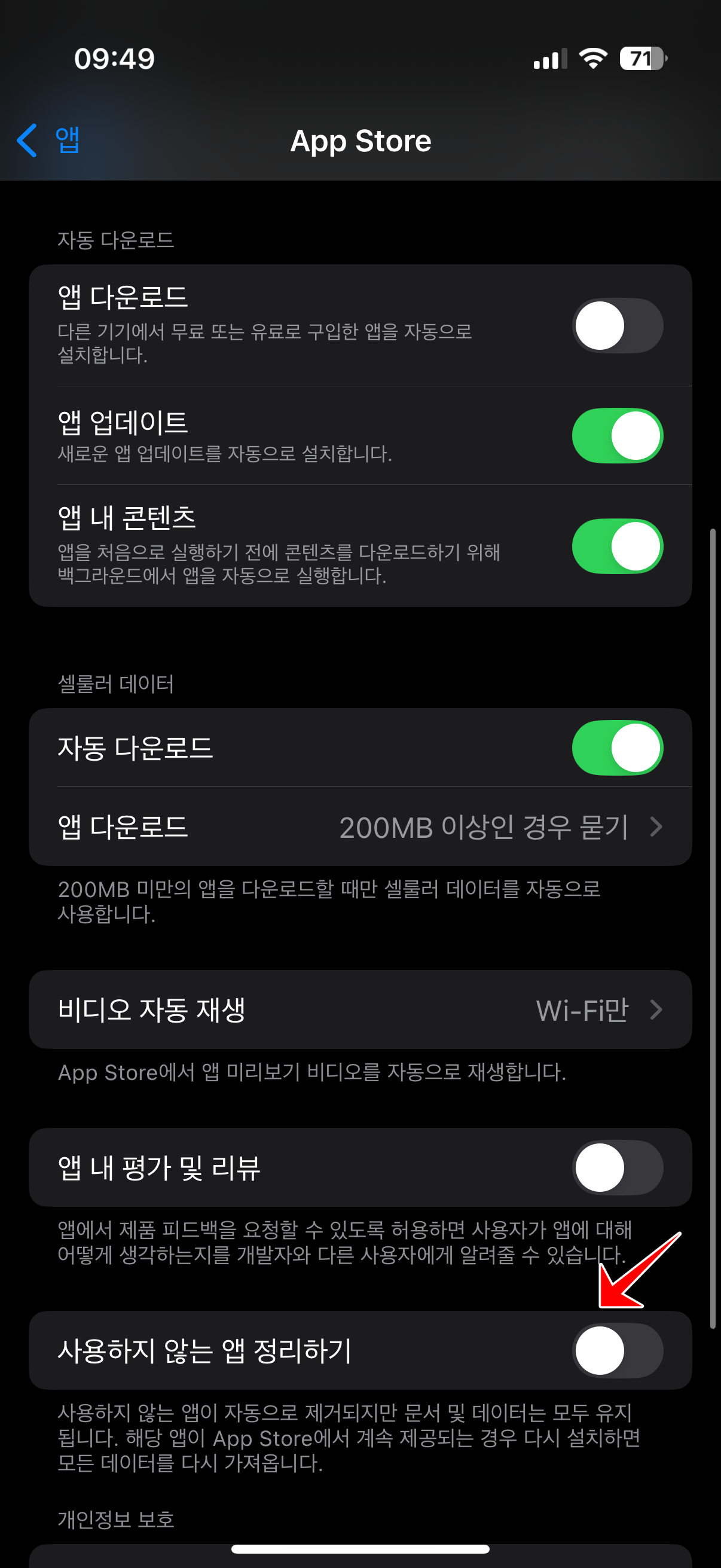 [사용하지 않는 앱 정리하기] 옵션을 체크 해제 하면, 저장용량을 차지하더라도 앱을 지우지 않고 계속 유지하게 됩니다.