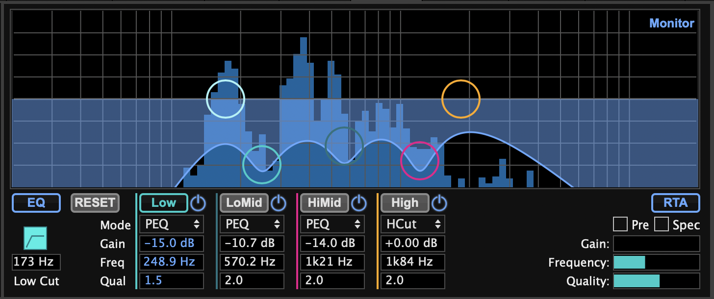 공간 울림은 공간 자체에서 공명이 일어나는 주파수를 파악해서 미리 전체 EQ에서 조정하면 됩니다. 공간 속에 사람이 있으면 사람은 흡음재 역할을 하기 때문에 너무 많이 EQ를 조절하지 않으셔도 됩니다.