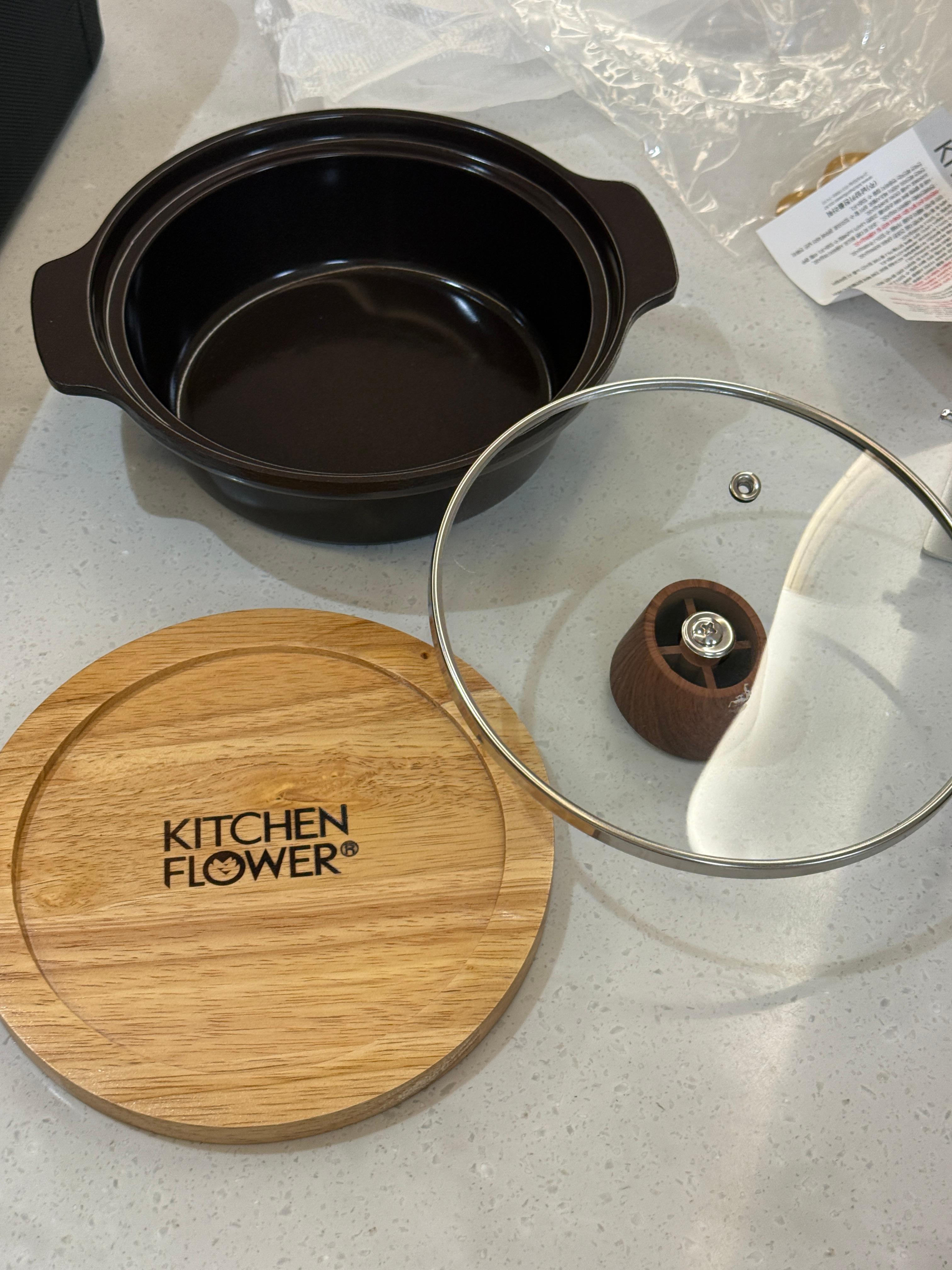 구성은 뚝배기 본체와 뚜껑, 나무 받침입니다. 크기는 16cm로 2인용 식사에 적당하고, 무게도 무겁지 않아서 조리와 세척이 부담되지 않았어요. 다만, 손잡이 부분에는 실리콘이나 보호 커버가 없어 조리 후에는 반드시 장갑이나 주방용 집게를 사용하시는 걸 추천드려요!