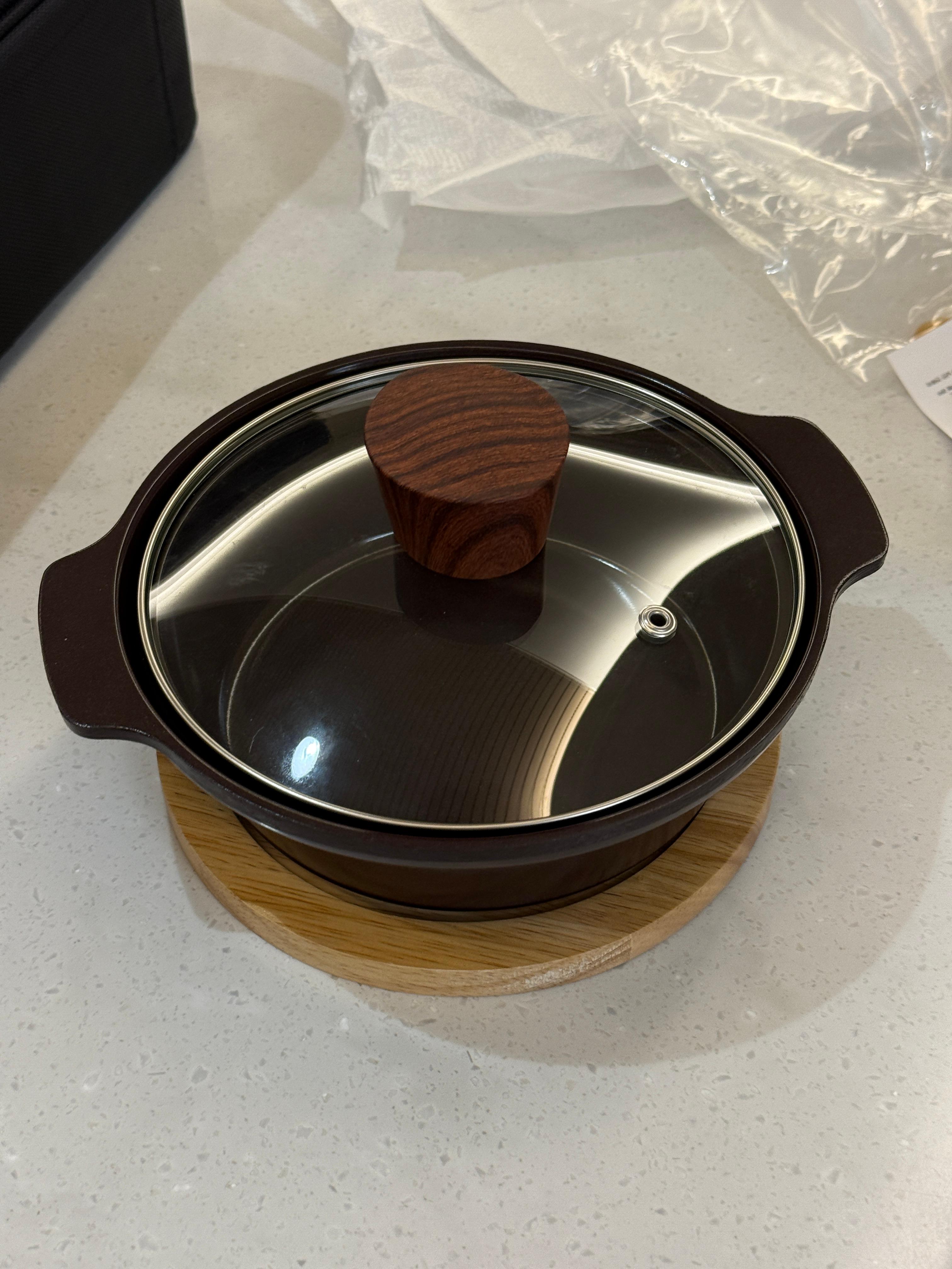 구성은 뚝배기 본체와 뚜껑, 나무 받침입니다. 크기는 16cm로 2인용 식사에 적당하고, 무게도 무겁지 않아서 조리와 세척이 부담되지 않았어요. 다만, 손잡이 부분에는 실리콘이나 보호 커버가 없어 조리 후에는 반드시 장갑이나 주방용 집게를 사용하시는 걸 추천드려요!
