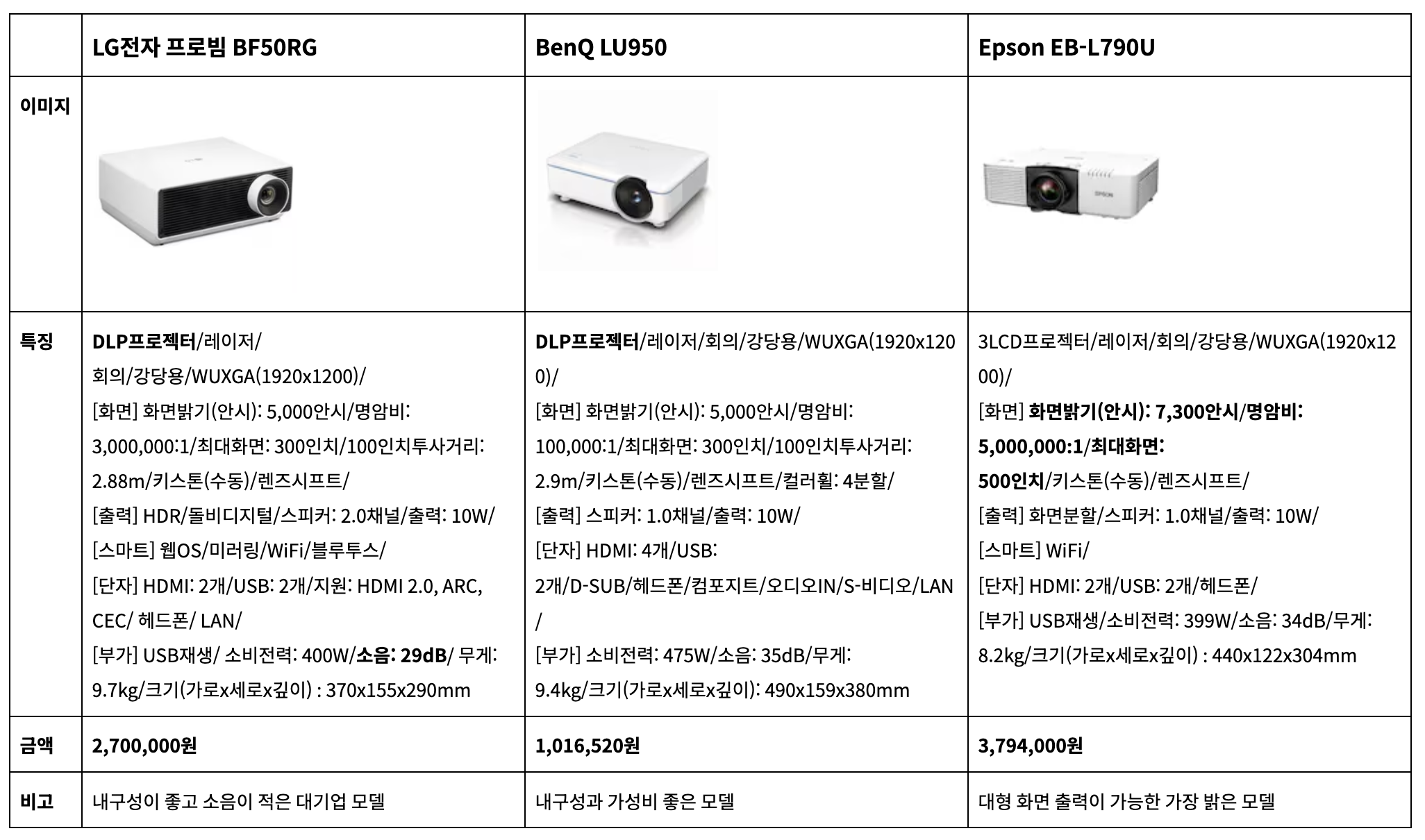 개척하며 구입한 LCD 방식의 프로젝터가 오래 되어서 밝기도 줄어들고 화질도 나빠져서 교체를 위해 제품들을 알아보았습니다. 상가 교회라 조명이 적은 상태에서 예배를 드려서 엄청나게 밝을 필요도 없고 스피커나 웹OS도 필요 없는데, 화면만 나오는 제품은 이제 안 나오더라구요. 비교적 출시된 지 오래된 제품 중에 가격대별로 제품을 골라 보았습니다.